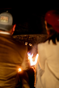 Stefan takes care of the campfire, film, beers and s’mores in the field behind their lodge