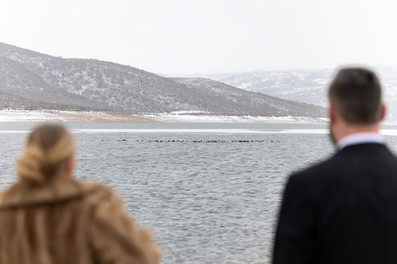 Private elopement ceremony at a frozen lake near Park City, with mountain views and snowy slopes in the background.